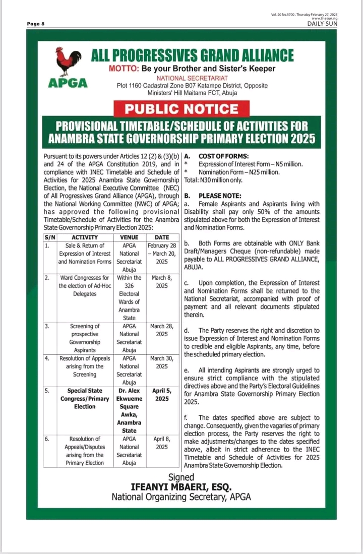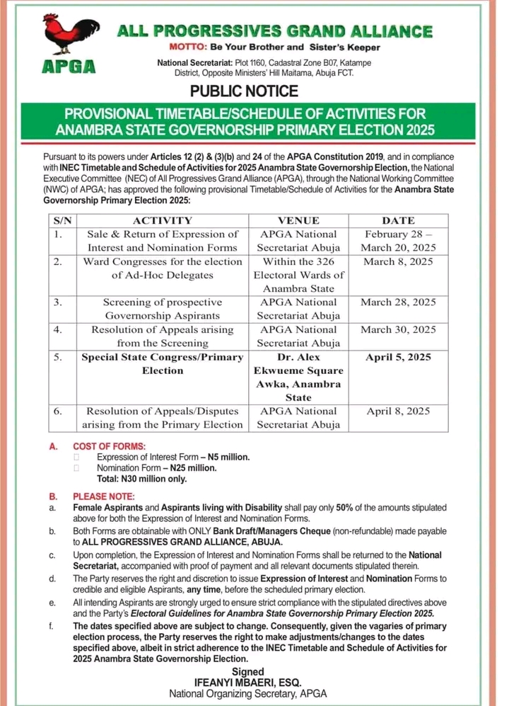 The All Progressives Grand Alliance (APGA) has released its provisional timetable and schedule of activities for the 2025 Anambra State Governorship Primary Election.