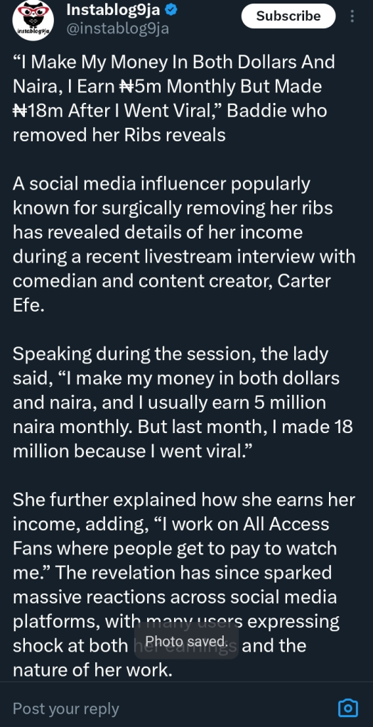 A popular social media influencer, known for undergoing a procedure to remove some of her ribs, recently opened up about her earnings during a livestream conversation with comedian and creator Carter Efe.