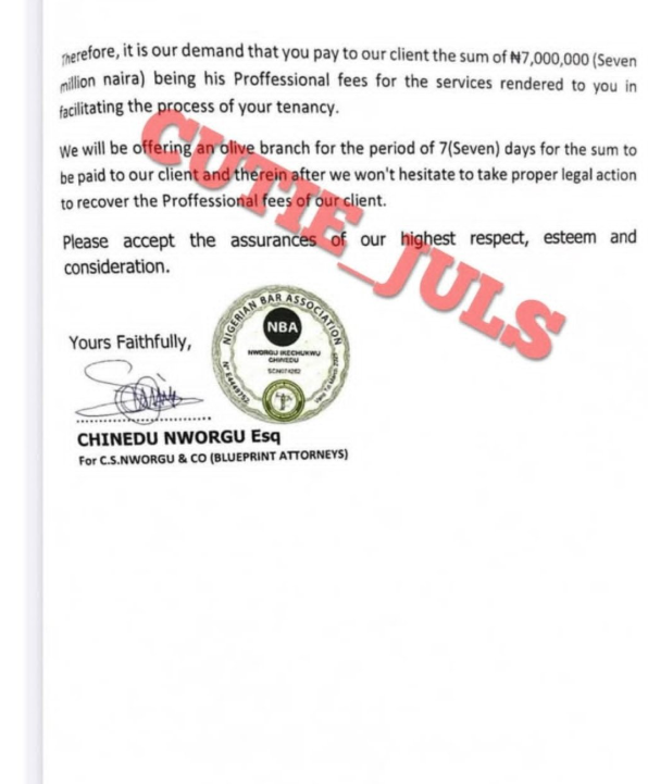 C.S. Nworgu & Co. is demanding that the couple pay the ₦7 million within seven days, stating that the notice serves as a final request before commencing legal action to recover the amount.