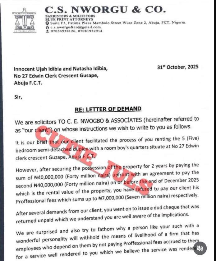 The solicitors allege that after securing the two-year property rental, for which the Idibias reportedly paid ₦40 million upfront and agreed to pay another ₦40 million by December 2025, the couple failed to settle the professional fees of ₦7 million charged for facilitating the transaction.