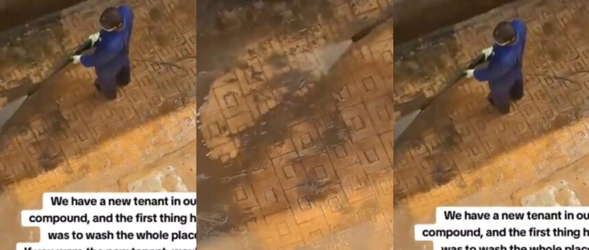 A video has gone viral on X (formerly Twitter) after a new tenant was seen immediately washing the entire compound upon moving into his new residence.