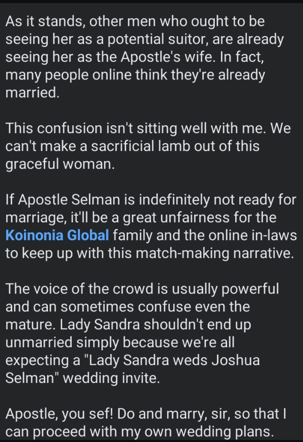“As it stands, other men who ought to be seeing her as a potential suitor, are already seeing her as the Apostle’s wife. In fact, many people online think they’re already married. This confusion isn’t sitting well with me. We can’t make a sacrificial lamb out of this graceful woman.”
