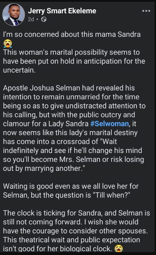 A Nigerian man, Jerry Smart Ekele, has publicly expressed concern that interior designer Sandra Areh might remain unmarried amid ongoing speculation surrounding her relationship with popular clergyman, Apostle Joshua Selman.