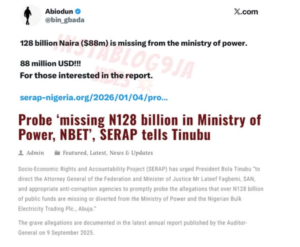 The Socio-Economic Rights and Accountability Project (SERAP) has raised alarm over the alleged disappearance of ₦128 billion from Nigeria’s Ministry of Power and the Nigerian Bulk Electricity Trading Plc (NBET), calling on President Bola Tinubu to order an immediate investigation.