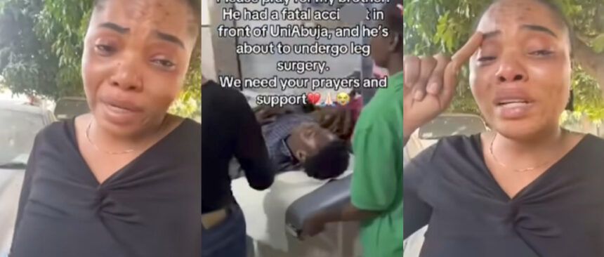 “University of Abuja you need to come to my aid at this point, I cannot do it alone; I’m traumatized. How school go dey set test around 5 am? He was struggling to go to school this morning, in front of university of Abuja that was how keke cleared him. The keke was following one-way. As I am talking to you now, he is unconscious, and they’re about to do surgery. As I am talking to you now, it’s 50/50; it’s either they do the surgery or they remove the leg. Please the bills is too much for me. It was the SUG that called me to come and carry my brother. They took him to two hospitals they rejected him because of the condition. As I am talking to you now, they arrested the keke man but they’re about to release him.”